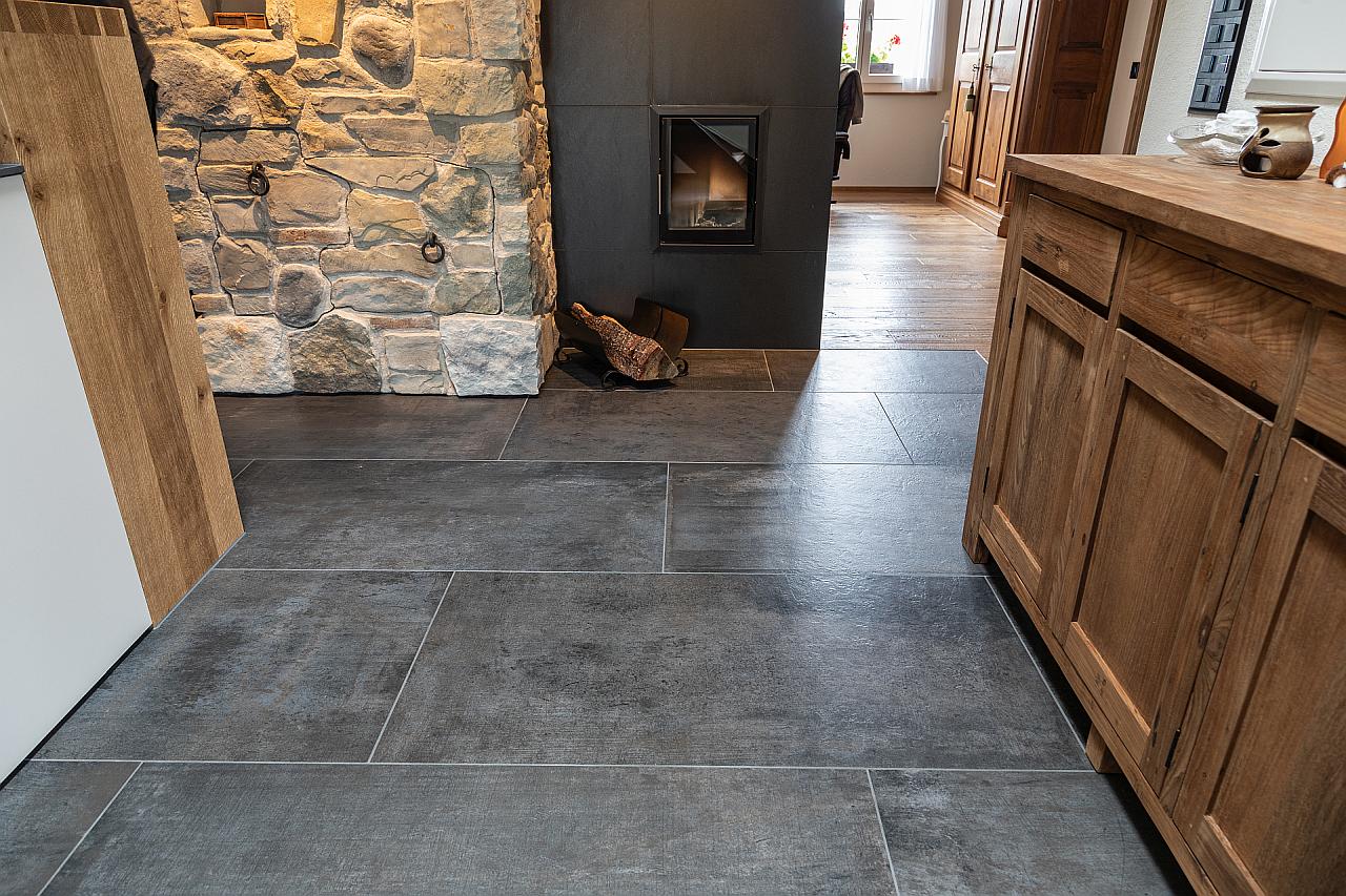 Verlegen von grossformatigen Platten 60x120cm um den Schwedenofen als Brandschutz verlegt